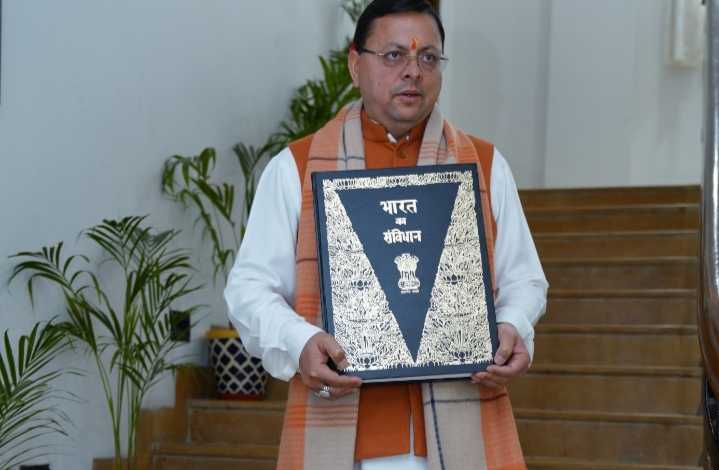 देहरादून : भारत के संविधान की मूल प्रति के साथ मुख्यमंत्री आवास से विधानसभा जाते हुए मुख्यमंत्री पुष्कर सिंह धामी