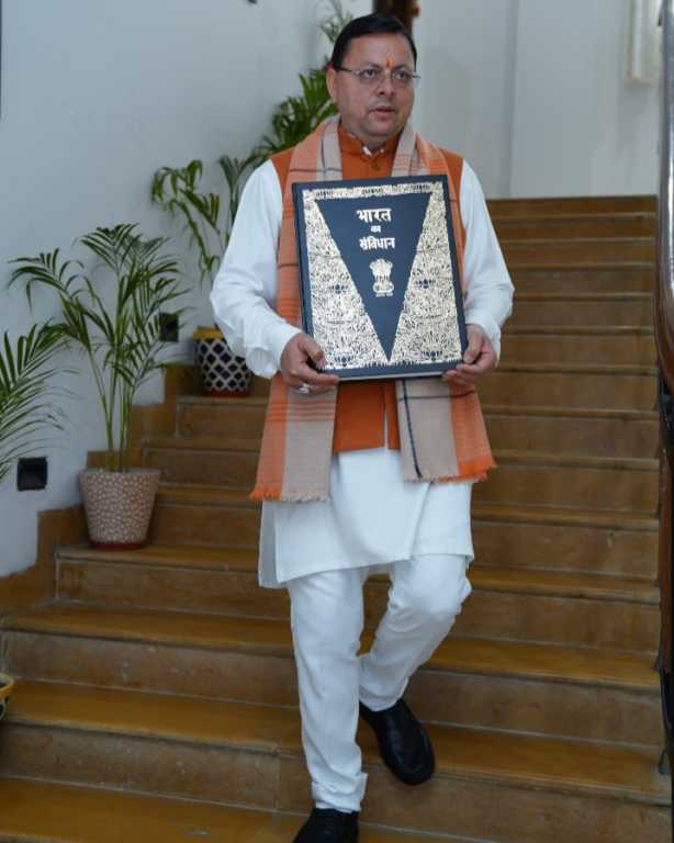 देहरादून : भारत के संविधान की मूल प्रति के साथ मुख्यमंत्री आवास से विधानसभा जाते हुए मुख्यमंत्री पुष्कर सिंह धामी।
