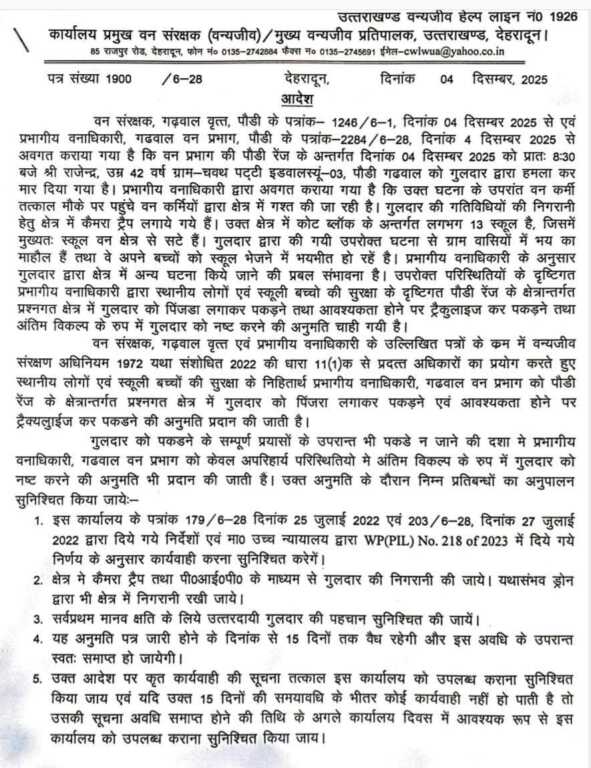 पौड़ी गढ़वाल: आज प्रातः लगभग 8:30 बजे पौड़ी गढ़वाल के ग्राम चवथ पट्टी, इडवालस्यूं-03 में गुलदार के हमले में 42 वर्षीय राजेन्द्र की दर्दनाक मृत्यु हो गई। घटना के बाद क्षेत्र में शोक और भय का माहौल व्याप्त हो गया है। स्थानीय ग्रामीणों के अनुसार पिछले कुछ समय से क्षेत्र में गुलदार की गतिविधियाँ देखी जा रही थीं, लेकिन अचानक हुए इस हमले ने पूरे गाँव को दहशत में डाल दिया है। घटना की जानकारी मिलते ही वन मंत्री सुबोध उनियाल ने मामले की गंभीरता को देखते हुए तत्काल वन विभाग के उच्च अधिकारियों से वार्ता की और नागरिकों की सुरक्षा को प्राथमिकता देते हुए आवश्यक निर्देश जारी किए। मंत्री के निर्देशों के बाद मुख्य वन संरक्षक/मुख्य वन्यजीव प्रतिपालक उत्तराखंड, देहरादून द्वारा आधिकारिक आदेश निर्गत कर दिए गए जिसमें गुलदार को पकड़ने, ट्रैंक्विलाइज़ करने और यदि सभी प्रयास विफल हों एवं परिस्थिति अत्यंत बाध्यकारी हो तो अंतिम विकल्प के रूप में गुलदार को नष्ट करने तक की अनुमति प्रदान की गई है।जारी आदेश संख्या 1900/6-28, दिनांक 04 दिसंबर 2025 के अनुसार वन विभाग क्षेत्र में कैमरा ट्रैप, ड्रोन मॉनिटरिंग, पीटीएस रैंक तथा पिंजरे लगाने जैसे उपायों के माध्यम से गुलदार की गतिविधियों का पता लगाकर उसे पकड़ने के प्रयास करेगा। इस कार्रवाई के लिए 15 दिनों की विशेष अनुमति दी गई है, जिसके दौरान वन विभाग सक्रिय निगरानी रखेगा और आवश्यकता पड़ने पर आदेश की अवधि बढ़ाई भी जा सकेगी। आदेश में स्पष्ट कहा गया है कि प्राथमिक लक्ष्य गुलदार को सुरक्षित रूप से पकड़ना है, लेकिन यदि मानव जीवन की सुरक्षा को देखते हुए परिस्थिति नियंत्रण से बाहर हो जाए तो अधिकृत विभागीय कर्मचारी ही उसे नष्ट करने की कार्यवाही कर सकेंगे। साथ ही निर्देश जारी किए गए हैं कि पकड़े जाने पर इसकी सूचना तत्काल विभागीय कार्यालय को दी जाएगी ताकि आगे की प्रक्रिया की पुष्टि हो सके।