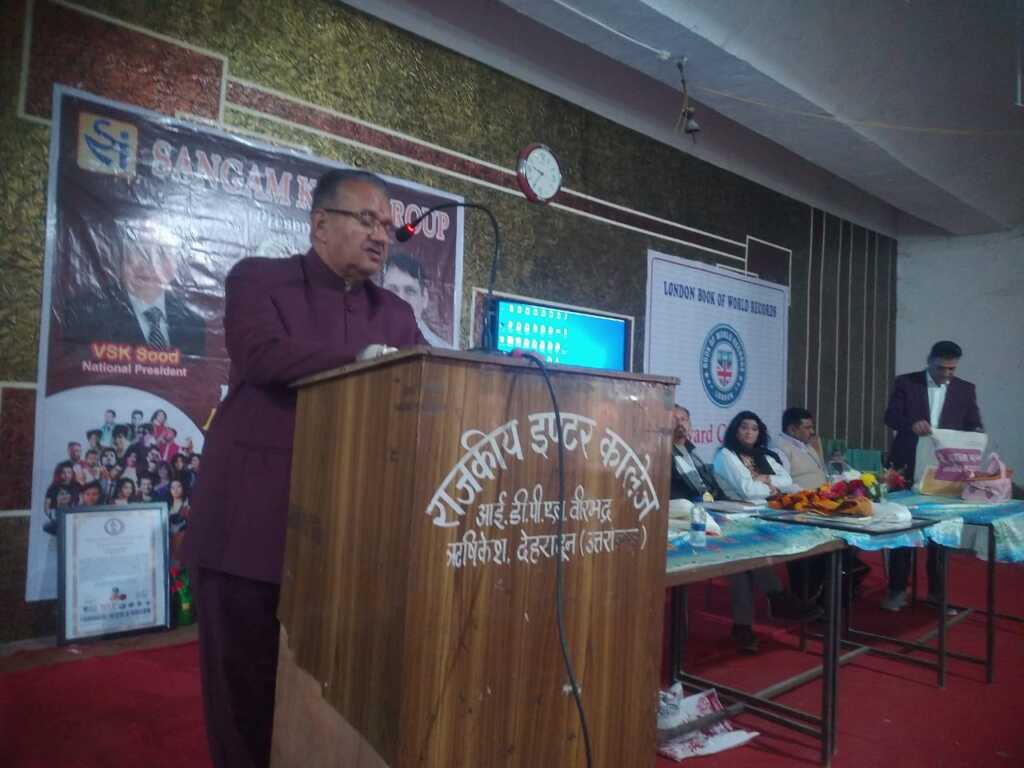 ऋषिकेश :(मनोज रौतेला) मंगलवार को कई #साहित्यकार जुटे तीर्थनगरी में. #भारतीय #साहित्य #संगम द्वारा अखिल भारतीय #कवि #सम्मेलन, #पुस्तक #विमोचन तथा #सम्मान #समारोह पी. एम. श्री राजकीय इंटर कॉलेज #आईडीपीएल के #सभागार में आयोजित किया गया। कार्यक्रम का शुभारंभ मुख्य अतिथि कृषि एवं सैनिक कल्याण #मंत्री गणेश जोशी,राष्ट्रीय अध्यक्ष डॉ. धीरेंद्र रांगड़, फिल्म निर्माता डॉ राजेश डोभाल ने मां सरस्वती के चित्र पर माल्यार्पण तथा दीप प्रज्वलित कर किया। भारतीय साहित्य संगम द्वारा ऑनलाइन व्याख्यान माला तथा अखिल भारतीय कवि सम्मेलन के 330 श्रृंखलाएं आयोजित कर कीर्तिमान बनाए जाने पर “वर्ल्ड रिकॉर्ड लंदन” द्वारा सम्मानित किया गया। यह सम्मान राष्ट्रीय अध्यक्ष डॉ धीरेंद्र रांगड़, डॉ राजेश डोभाल, मनोज कुमार गुप्ता,शंभू प्रसाद भट्ट, संजीव कुमार चौहान तथा डॉ देवीदिन अविनाशी को कृषि मंत्री द्वारा प्रदान किया गया।