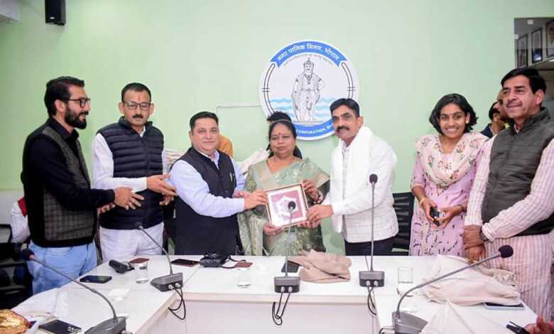 भोपाल : ऋषिकेश मेयर शम्भू पासवान ने महापौर मालती राय और नगर निगम कमिश्नर संस्कृति जैन से मुलाकात कर उन्हें उत्तराखंड की संस्कृति के प्रतीक ऐपण कला भेंट की