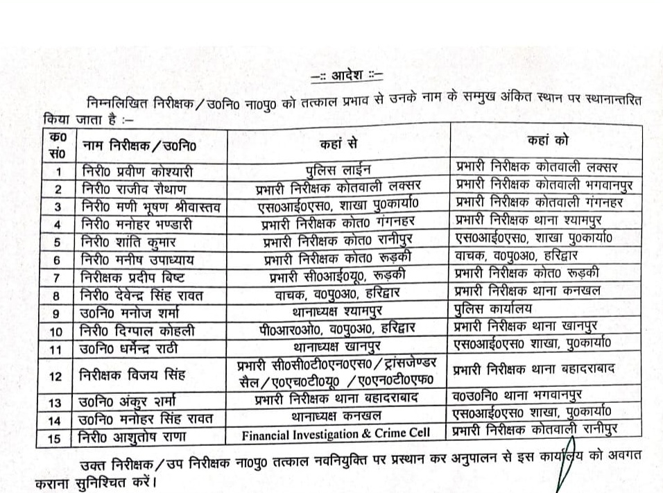 हरिद्वार में कई इंस्पेक्टर और सब इंस्पेक्टर के ट्रान्सफर, लिस्ट देखें