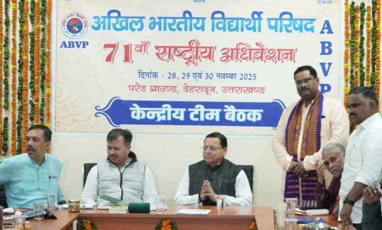 देहरादून: मुख्यमंत्री पुष्कर सिंह धामी ने आज दून विश्वविद्यालय में अखिल भारतीय विद्यार्थी परिषद (ABVP) के 28 से 30 नवम्बर 2025 को देहरादून में 71वें राष्ट्रीय अधिवेशन के आयोजन से संबंधित केंद्रीय टीम की बैठक में प्रतिभाग किया।बैठक में मुख्यमंत्री ने अधिवेशन की तैयारियों की विस्तृत जानकारी ली और आयोजन से जुड़ी व्यवस्थाओं की समीक्षा की। उन्होंने कहा कि इस तरह के राष्ट्रीय स्तर के अधिवेशन युवा शक्ति को एक मंच प्रदान करते हैं, जहाँ विचार-विमर्श के माध्यम से राष्ट्र निर्माण की दिशा में ठोस संकल्प लिए जाते हैं।मुख्यमंत्री ने कहा कि एबीवीपी जैसे संगठन देश की युवा ऊर्जा को सकारात्मक दिशा देने में निरंतर अग्रणी भूमिका निभा रहे हैं। उन्होंने अधिवेशन के सफल आयोजन के लिए शुभकामनाएँ देते हुए कहा कि उत्तराखंड की धरती पर आयोजित यह राष्ट्रीय अधिवेशन निश्चित रूप से युवाओं में नए उत्साह, ऊर्जा और देशभक्ति की भावना का संचार करेगा।