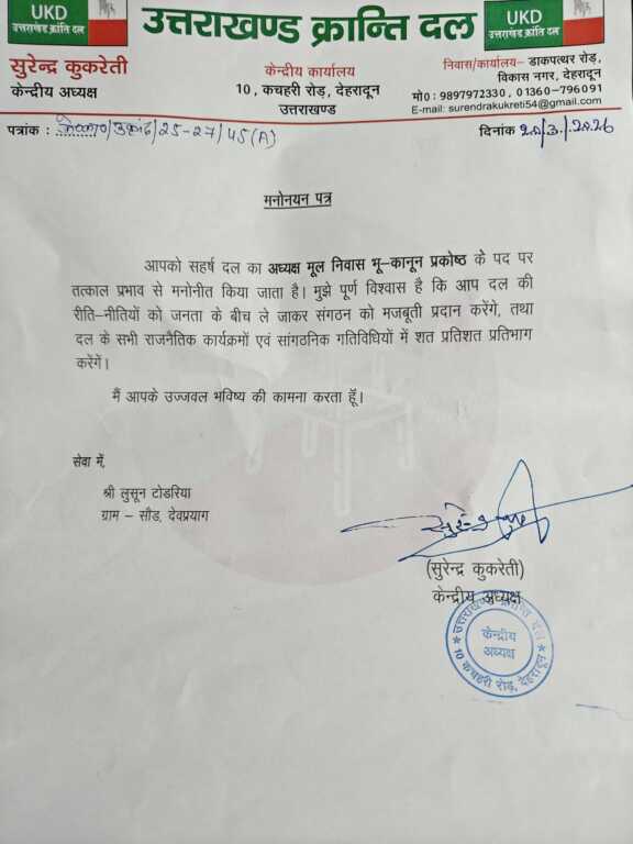 देहरादून : लुसुन टोडरिया को UKD में मूल निवास भू कानून प्रकोष्ठ का केंद्रीय अध्यक्ष बनाया गया