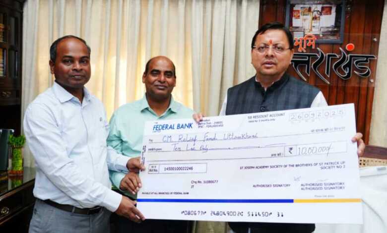 देहरादून: सेंट जोसेफ अकादमी ने सौंपा १० लाख रूपये का चेक आपदा पुनर्निर्माण के कार्यों के लिए मुख्यमंत्री को