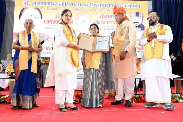 दीपांकुश चित्रांश क़ी रिपोर्ट…खबर उत्तर प्रदेश के सुल्तानपुर जिले से है जहाँ डॉ राम मनोहर लोहिया अवध विश्वविद्यालय अयोध्या द्वारा आयोजित दीक्षांत समारोह में गनपत सहाय महाविद्यालय सुल्तानपुर की छात्रा दिव्यांशी श्रीवास्तव को बी.एस.सी. (बायो ग्रुप) में विश्वविद्यालय स्तर पर सर्वाधिक अंक प्राप्त करने पर उत्तर प्रदेश की महामहिम राज्यपाल श्रीमती आनंदीबेन पटेल व उत्तर प्रदेश सरकार में उच्च शिक्षा मंत्री योगेंद्र उपाध्याय के द्वारा गोल्ड मेडल प्रदान किया गया।उक्त अवसर पर उत्तर प्रदेश सरकार में उच्च शिक्षा राज्य मंत्री श्रीमती रजनी तिवारी और विश्वविद्यालय के कुलपति कर्नल बिजेंद्र सिंह की उपस्थिति रही। दिव्यांशी की इस उपलब्धि पर महाविद्यालय के प्रबंधक डॉ.ओम प्रकाश पाण्डेय बजरंगी और महाविद्यालय के प्राचार्य प्रो.(डॉ.) अंग्रेज सिंह ने प्रसन्नता व्यक्त करते हुए छात्रा को आशीर्वाद रूपी शुभकामनाएं दी और उज्जवल भविष्य की कामना की। दिव्यांशी ने अपनी सफलता का श्रेय अपने माता- पिता एवं गुरुजनों को दिया जिनके कुशल मार्गदर्शन और उत्कृष्ट शिक्षण कार्य से यह संभव हो पाया है।