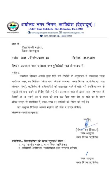 ऋषिकेश/देहरादून : देहरादून दिनांक 01 फरवरी 2026 (सूवि)* जिला प्रशासन देहरादून द्वारा बड़ी कार्रवाई करते हुए बिना सीवर संयोजन के सीधे गंगा जी में जा रहे 14 घरों का ग्रे वॉटर बंद कर दिया है तथा 2 नालियों की टैपिंग कर दी गई है । विगत दिवस जिलाधिकारी सविन बंसल द्वारा चंदेश्वर नाला ऋषिकेश का निरीक्षण किया। निरीक्षण के दौरान जिलाधिकारी ने ढालवाला नाले में अपशिष्ट जल (ग्रे-वाटर) प्रवाहित होने पर गहरी नाराजगी व्यक्त करते हुए नगर निगम, ऋषिकेश एवं जल संस्थान (गंगा), ऋषिकेश के अधिकारियों को नाले में छोड़े जा रहे अपशिष्ट जल के सभी पाइप तत्काल बंद कराने के निर्देश दिए गए