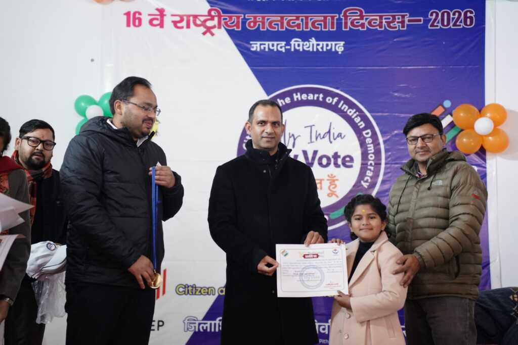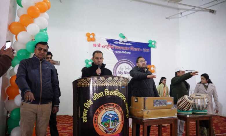 जनपद पिथौरागढ़ में 16वां राष्ट्रीय मतदाता दिवस भव्यता एवं उत्साह के साथ मनाया गया। इस अवसर पर लक्ष्मण सिंह महर कैंपस कॉलेज, पिथौरागढ़ में जिला स्तरीय कार्यक्रम का आयोजन किया गया।कार्यक्रम का शुभारम्भ जिला निर्वाचन अधिकारी/जिलाधिकारी पिथौरागढ़ आशीष कुमार भटगांई द्वारा किया गया। अपने संबोधन में जिलाधिकारी ने लोकतंत्र में मतदाता की भूमिका को अत्यंत महत्वपूर्ण बताते हुए सभी नागरिकों से निर्भीक, निष्पक्ष एवं जागरूक होकर मतदान करने की अपील की।