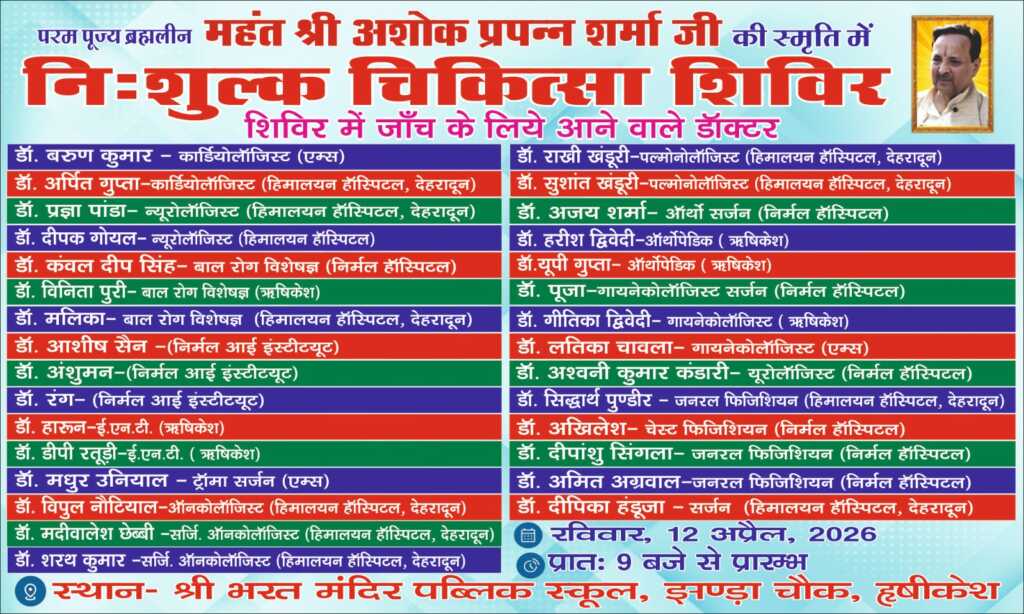 ऋषिकेश : गुरूवार को यानी दिनांक 9 अप्रैल 2026 को श्री भरत मंदिर झंडा चौक में आगामी 12 अप्रैल 2026 को लगने वाले निशुल्क स्वास्थ्य शिविर को लेकर रूपरेखा तैयार की गई,, इस इस अवसर पर महंत वत्सल प्रपनाचार्य जी महाराज ने कहा कि यह शिविर निशुल्क होगा. जिसमें दिखाने वाले रोगियों को एक महीने तक का परामर्श बिल्कुल निशुल्क होगा. जरूरतमंद व्यक्तियों के लिए जरूरी जांच और दवाइयां भी निशुल्क दी जाएगी.
