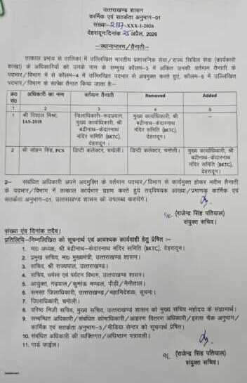 उपजिलाधिकारी ने कर्णप्रयाग में अपने उपजिलाधिकारी कार्यकाल के दौरान प्रभावी प्रशासन, जनहितकारी फैसलों और मजबूत प्रबंधन क्षमता का परिचय दिया है। आपदा प्रबंधन में तत्परता, जनसमस्याओं का त्वरित समाधान तथा विकास योजनाओं के सफल क्रियान्वयन से उन्होंने अपनी अलग पहचान बनायी है।अब बदरीनाथ केदारनाथ धाम जैसे विश्वप्रसिद्ध आस्था केंद्रों की व्यवस्थाओं की जिम्मेदारी उनके कंधों पर होगी। उनकी नियुक्ति से उम्मीद है कि मंदिर समिति की कार्यप्रणाली और अधिक पारदर्शी, सुव्यवस्थित और श्रद्धालु-हितैषी बनेगी। बीकेटीसी मीडिया प्रभारी डा. हरीश गौड़ ने बताया कि बीकेटीसी कर्मचारी संघ, सहित विभिन्न धार्मिक संगठनों जनप्रतिनिधियों,हकहकूकधारियों ने नवनियुक्त बीकेटीसी मुख्य कार्याधिकारी को शुभकामनाएं दी है शासन के निर्णय का स्वागत किया और विश्वास जताया है कि उनके नेतृत्व में बदरीनाथ -केदारनाथ धाम की यात्रा व्यवस्थाएं और अधिक मजबूत होंगी।