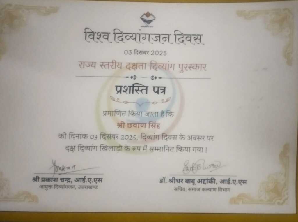 टिहरी : विश्व दिव्यांगजन दिवस….के अवसर पर उत्तराखंड सरकार द्वारा आयोजित राज्य स्तरीय सम्मान समारोह में जिले के प्रतिभाशाली खिलाड़ी छवाण सिंह को राज्य स्तरीय दक्षता दिव्यांग पुरस्कार से सम्मानित किया गया।छवाण सिंह, जो स्पाइनल कॉर्ड इंजरी के कारण व्हीलचेयर पर रहते हुए भी अपने सभी कार्य स्वयं करते हैं, लगातार खेल जगत में उत्कृष्ट प्रदर्शन कर रहे हैं। उनकी इसी अद्भुत लगन और समर्पण को देखते हुए समारोह में उन्हें प्रशस्ति पत्र के साथ एक मेडल तथा ₹8000 की पुरस्कार राशि प्रदान की गई।न वे दोगी पट्टी इलाके के रहने वाले हैं. यह सम्मान दिव्यांग खिलाड़ियों को प्रोत्साहित करने, उनकी क्षमताओं को पहचान दिलाने और उनके मनोबल को मज़बूत करने के उद्देश्य से हर वर्ष दिया जाता है। छवाण सिंह की यह उपलब्धि पूरे जिले के लिए गर्व का विषय है और सभी युवाओं व दिव्यांग खिलाड़ियों के लिए प्रेरणास्रोत भी है।छवाण सिंह कौन है ?