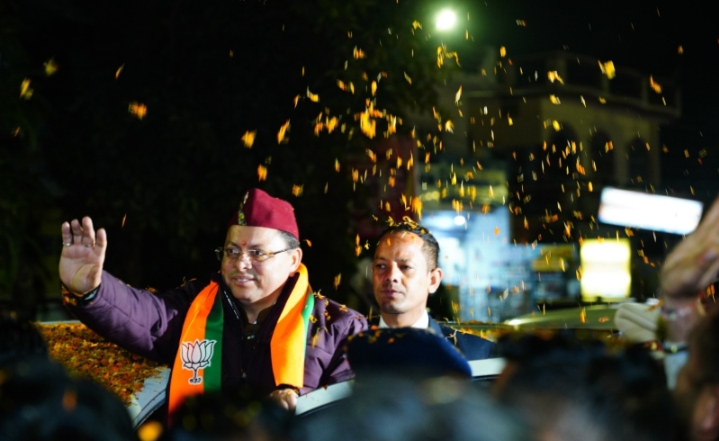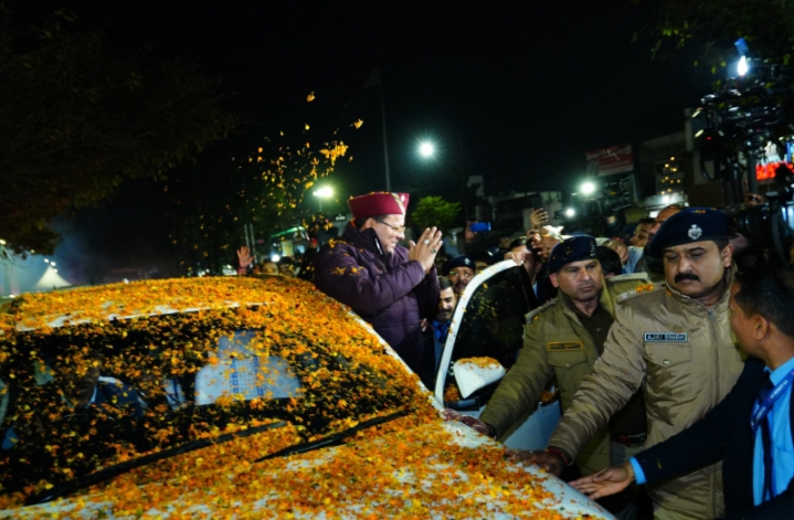 उत्त्तराखण्ड में UCC पारित होने के बाद, मुख्यमंत्री धामी का पुष्प वर्षा कर स्वागत हुआ