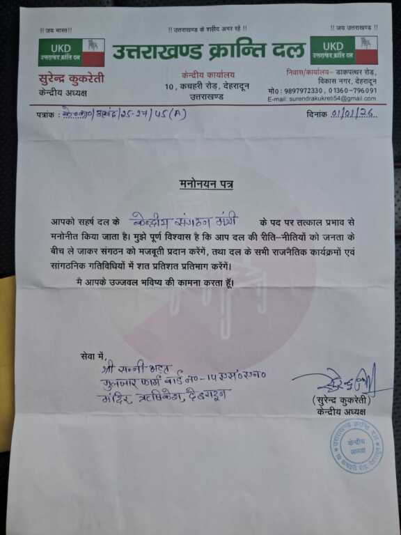 UK : सनी भट्ट को UKD ने “केंद्रीय संगठन मंत्री” के पद पर महत्वपूर्ण जिम्मेदारी सौंपी