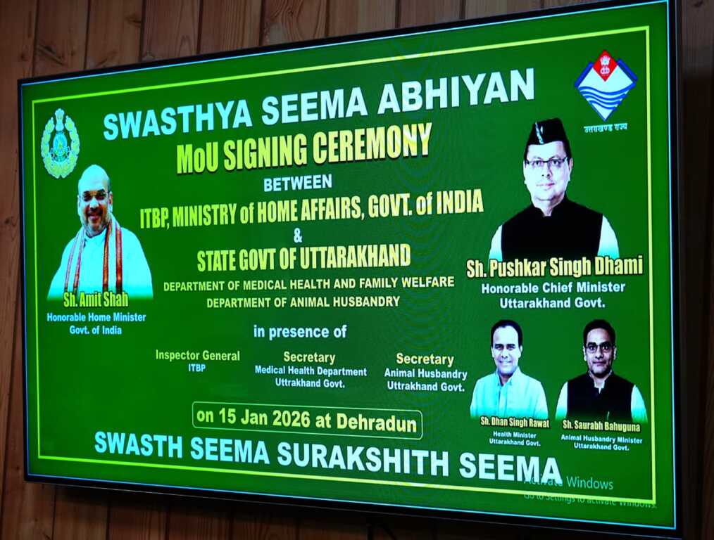 देहरादून : मुख्यमंत्री पुष्कर सिंह धामी की उपस्थिति में आज मुख्यमंत्री आवास में उत्तराखंड शासन एवं भारत–तिब्बत सीमा पुलिस (आईटीबीपी) के मध्य स्वस्थ सीमा अभियान के अंतर्गत एक महत्वपूर्ण समझौता ज्ञापन (MoU) पर हस्ताक्षर किए गए। इस अवसर पर स्वास्थ्य मंत्री डॉ. धन सिंह रावत एवं कैबिनेट मंत्री सौरभ बहुगुणा भी उपस्थित रहे।इस एमओयू का उद्देश्य पिथौरागढ़, चमोली एवं उत्तरकाशी जनपदों के अंतर्गत स्थित 108 सीमावर्ती गांवों में निवासरत नागरिक आबादी को एकीकृत प्राथमिक स्वास्थ्य सेवाएं उपलब्ध कराना है। यह अभियान चरण–1 के रूप में प्रारंभ किया जा रहा है, जिसके माध्यम से दुर्गम एवं सीमावर्ती क्षेत्रों में स्वास्थ्य सेवाओं की पहुंच को सुनिश्चित किया जाएगा।