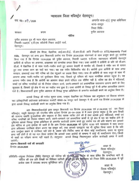 देहरादून : शहर के सहस्त्रधारा रोड स्थित एटीएस कालोनी में बिल्डर की गूंडागर्दी पर जिला मजिस्टेªट कोर्ट ने संज्ञान लेते हुए गुंडा एक्ट में नोटिस जारी करते हुए 07 दिन के भीतर प्रतिउत्तर प्रस्तुत करने के निर्देश दिए हैं प्रतिउत्तर प्राप्त न होने के की दशा में जिला बदर की कार्यवाही शुरू कर दी जाएगी। इससे पूर्व भी विवादित बिल्डर पर दीपावली में नाबालिग बच्चों पर पिस्टल लहराने तथा लाईसेंसी शस्त्र को प्रदर्शित करने पर डीएम ने शस्त्र लाईसेंसधारक पुनीत अग्रवाल की लापरवाही मानते हुए उनका शस्त्र जब्त करते हुए शस्त्र लाईसेंस निलम्बित कर दिया था। आरोपी बिल्डर पर डीआरडीओं वैज्ञानिक के साथ मारपीट एवं उत्पीड़न, नशे में धुत होकर एटीएस आरडब्ल्यूए अध्यक्ष के साथ मारपीट, बच्चों से गाली गलौच, दीपावली पर पिस्टल तानने, बच्चों से गाली गलौच एवं गाड़ी से टक्कर मारने का प्रयास, जनरल बाडी मीटिंग में धमकाने अभद्र भाषा का प्रयोग, आरोपी द्वारा निवासियों एवं आरडब्ल्यूए के सदस्यों को जानबूझकर झूठे मुकदमों एवं निराधार आरोपों में फंसाकर उत्पीड़न करने का प्रयास, विधवा महिला की भूमि को कूट रचित रजिस्ट्री एवं अनाधिकृत कब्जा मामलों विभिन्न धाराओं में 05 एफआईआर दर्ज हैं।